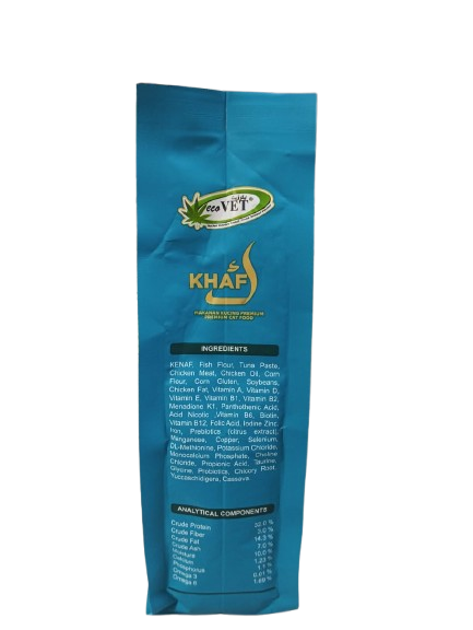- Bahan yang terkandung : Kenaf, tepung ikan, tuna, daging, minyak ayam, tepung jagung, kacang soya, vitamin A, vitamin D, vitamin E, vitamin B1, vitamin B2,